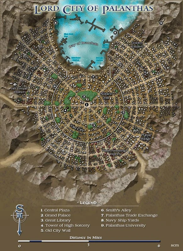 С высоты Палантас похож на огромное колесо: дороги образуют круговую спираль, а восемь больших проспектов, отходящих от Центральной площади, служат спицами этого колеса. За третьим кольцом дорог находится огромная стена, которая делит город на две части — Старый Город и Новый Город. Старый Город – сердце Палантаса. Здесь проживают лорд-регент и члены городского сената, и именно здесь находится большинство правительственных зданий. По другую сторону стены от Старого Города лежит Новый Город, занимающий предгорья Вингаардских гор. Подавляющее большинство жителей Палантаса проживает в Новом Городе.