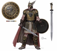 Caramon was known to have been left-handed, and he fought typically with a sword and shield and his famous dragon's wing helm.