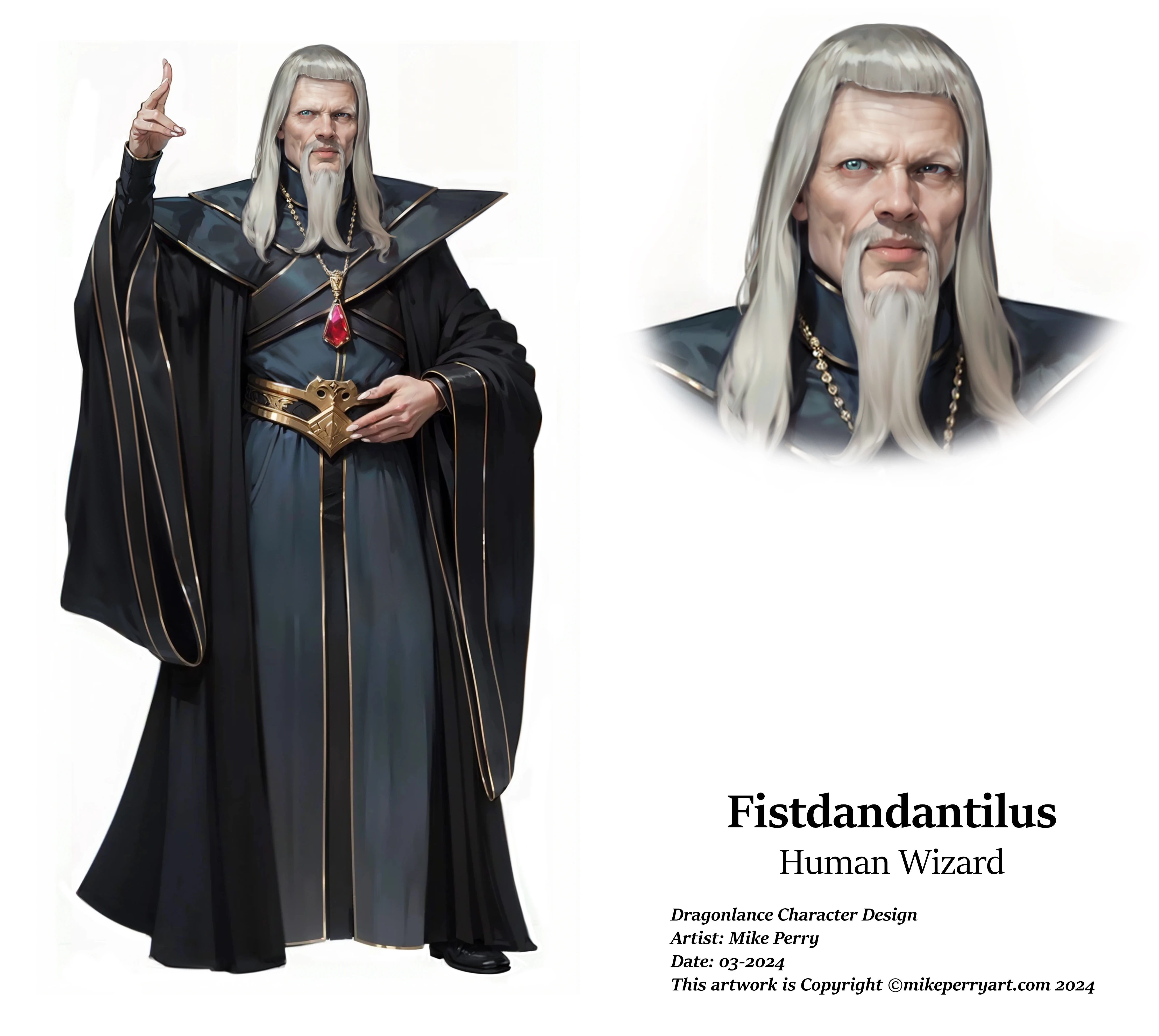 For reasons unknown, Fistandantilus was known to have joined a company of adventurers briefly in 1804 PC, who were led by the Ergothian warrior Vinas Solamnus, and were commissioned to free the sister of Emann Quisling, Emperor of Ergoth from some crazed priests. The black-robed mage aided Vinas in rescuing the noble from Raekel’s Pit and returning her to Daltigoth.